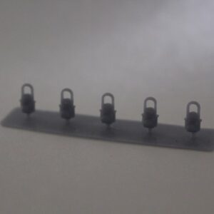 These 4mm scale (OO, EM or P4 gauge) 3D resin printed iron railing posts are printed with a 0.7mm hole through each ball to take a fine wire as a railing. Supplied in a strip of 5 ready for painting, the distance between the balls is 8mm (2 scale feet) and there is adequate material on the bottom of each post to insert into a hole in your baseboard. Add that additional realism to your model with the accurate scale model.